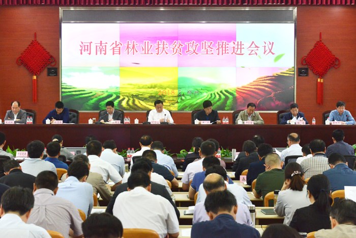 省林业厅厅长刘金山出席会议并讲话。省林业厅副厅长秦群立主持会议。省林业厅副巡视员李志锋宣读河南省林业厅打好林业精准脱贫攻坚战三年行动计划(2018-2020年)。省林业厅副厅长李军、师永全、杜清华,省森林防火专职副指挥长徐忠,省森林公安局局长朱延林等厅领导在主席台就座。